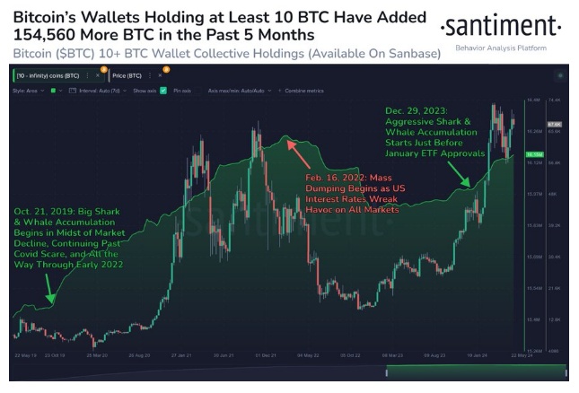 On-chain analytics platform Santiment revealed in an X (formerly Twitter) post that Bitcoin wallets holding at least 10 BTC have added 154,560 more BTC in the last five months. The platform noted that this purchase is significant as it is one of “crypto’s top leading indicators” when it comes to bullish signals for the flagship crypto.