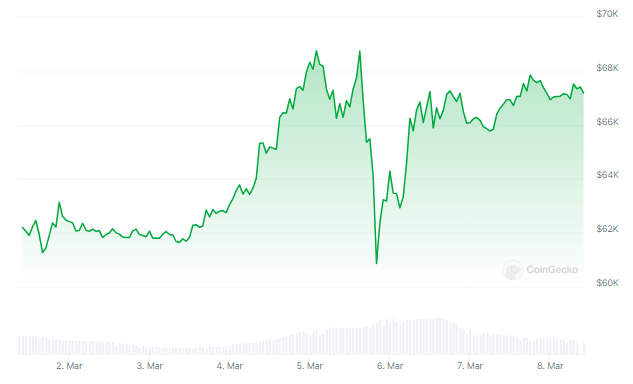 At the time of writing, Bitcoin was trading at $67,182, up 0.5% and 8.4% in the daily and weekly charts, data from Coingecko shows.