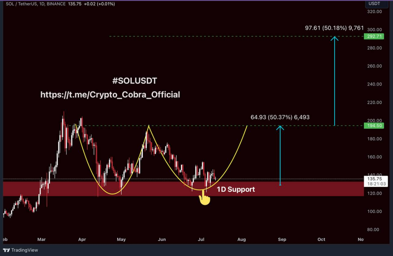 ➡️#SOL is currently tested the daily support zone of 130-120. we might see a bounce towards 180-200 & 250 (Possible 100% pump from current… pic.twitter.com/Szyp4y9ywl