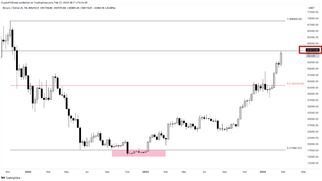 In a not-so unexpected turn of events, Bitcoin (BTC) has surged to new heights, breaking the $57,000 barrier during the early hours of Tuesday in the Asian market. This price level, not seen since November 2021, marks a significant resurgence for the leading cryptocurrency.