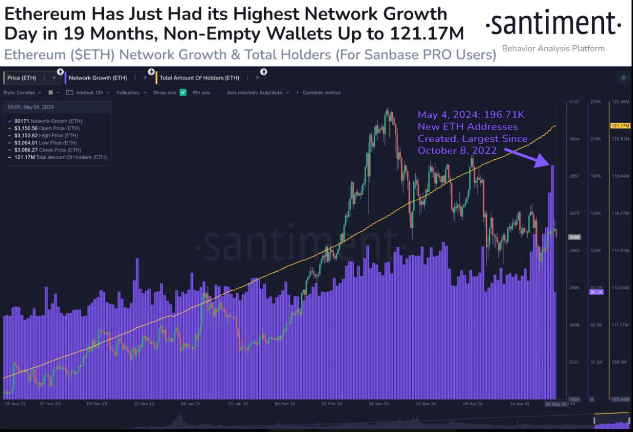 According to crypto data firm Santiment, May 4th saw a whopping 200,000 new Ethereum addresses created, marking the highest single-day growth in nearly two years.