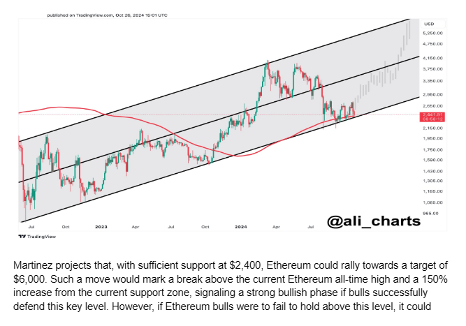 Martinez emphasizes that Ethereum’s current position at $2,400 represents a major support area within its ascending channel. If this level holds, it could serve as a foundational price floor, enabling Ethereum to rebound and continue forming higher highs along a bullish trajectory.