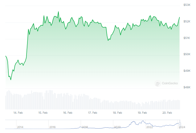BTCUSD currently trading at $52,388 on the daily chart: TradingView.com